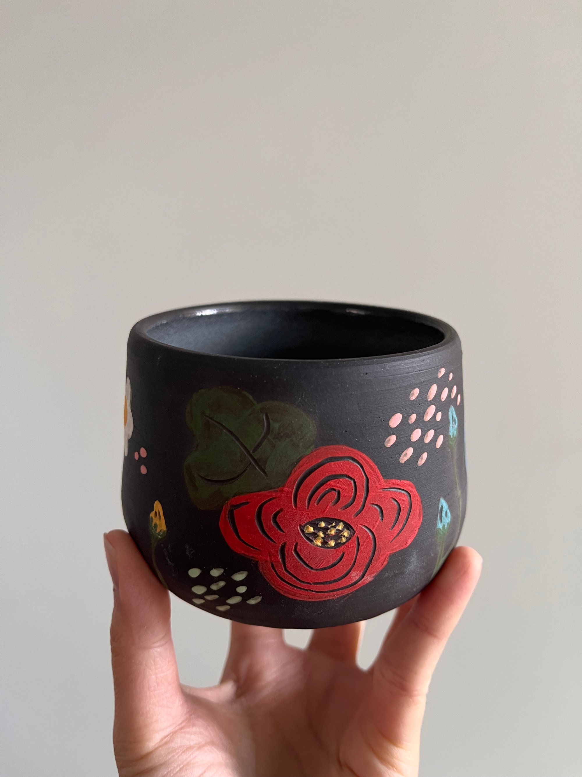 Floral sgraffito on a beautiful black clay. 💐 Unglazed on the outside with one of my glossy cloud glaze which I made myself! ☁️☁️☁️
